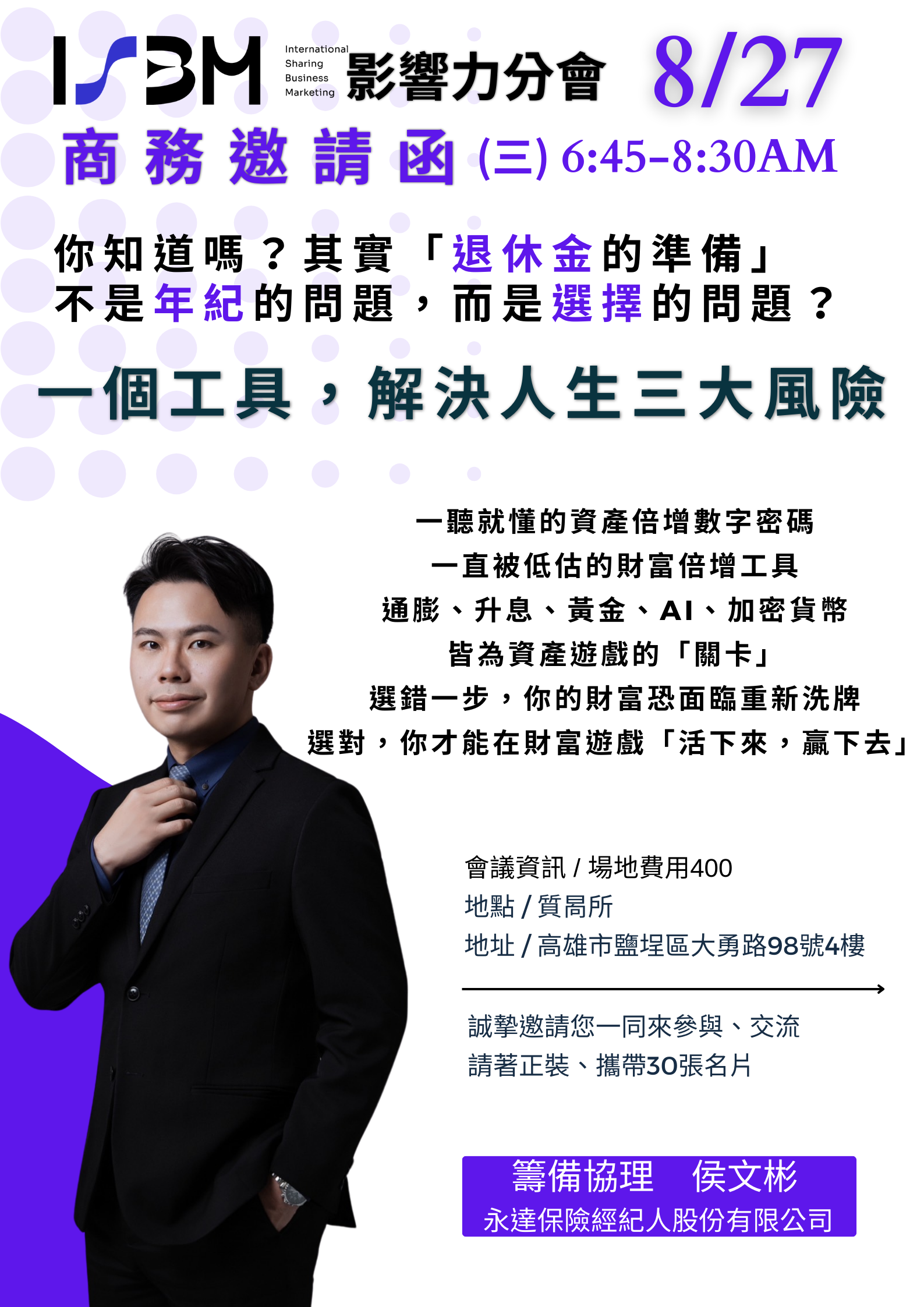 時間:8/27 (三) 早上6:45 - 8:30(請參加6:45的商務交流)地點:質晑所 (高雄市鹽埕區大勇路98號4樓)費用:場地費(含早餐) 400元主題:一個工具,解決人生三大風險