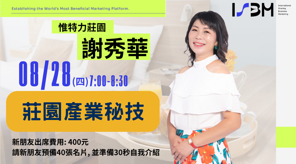 時間:08/28 (四) 早上7:00 - 8:30(請參加6:45的商務交流)地點:CHILL OUT(台中市西區中興街183號B2)費用:場地費(含早餐) 400元主題:莊園產業祕技-若您認同ISBM國際利他的核心價值,也願意給自己一個機會來認識最有效益的行銷平台,邀請您填寫「ISBM國際利他企業行銷平台會議」報名表單,將會有專人聯繫您,謝謝!