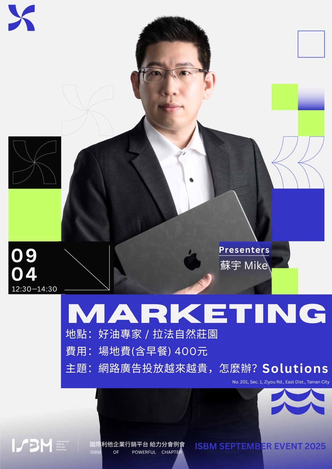 時間:09/04(四) 中午 13:00-14:30 (鼓勵參加12:30-13:00的商務交流)地點:好油專家3F(台南市東區自由路一段201號)費用:場地費(含早餐) 400元主題:網路廣告投放越來越貴,怎麼辦?Solutions