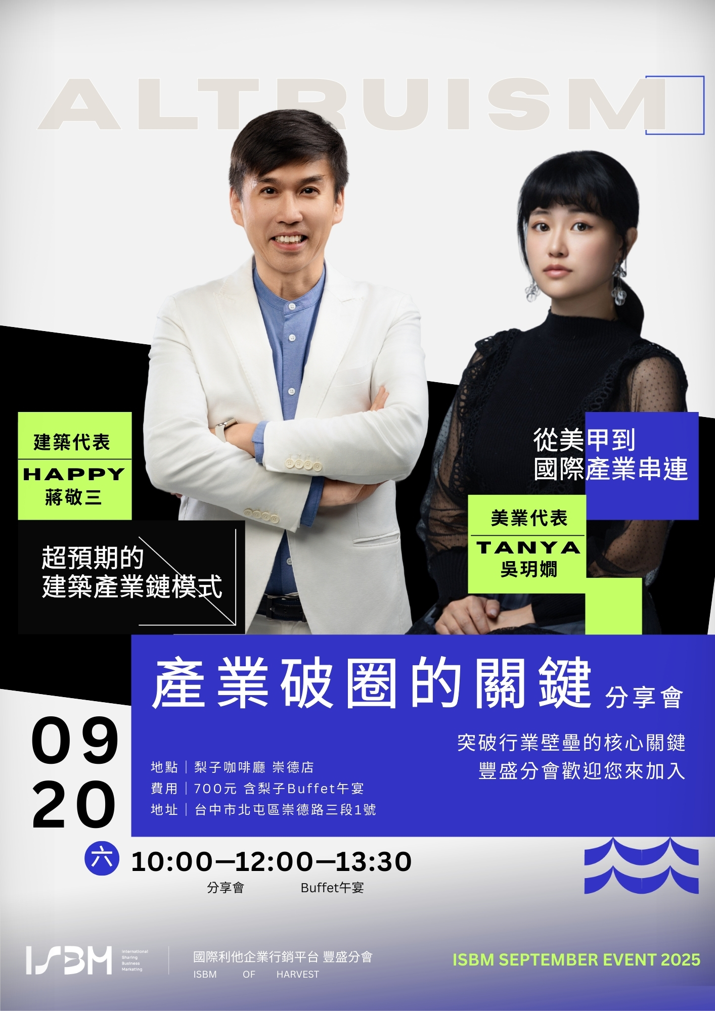ISBM豐盛分會-產業破圈關鍵分享會 「事業再努力,也可能遇到瓶頸;團隊再完整,也可能缺少突破的契機。真正的關鍵,在於能否找到跨圈連結、互補資源、願意真誠交流的夥伴。」 建築產業鏈模式 × 美甲到國際串連的真實案例,ISBM 豐盛分會帶你看見「破圈」如何成真。 ✼ 產業破圈的關鍵分享會 ✼ 邀請你聽見產業創新的真實見證,連結真誠利他的優秀夥伴,找到你的下一個事業突破機會。
