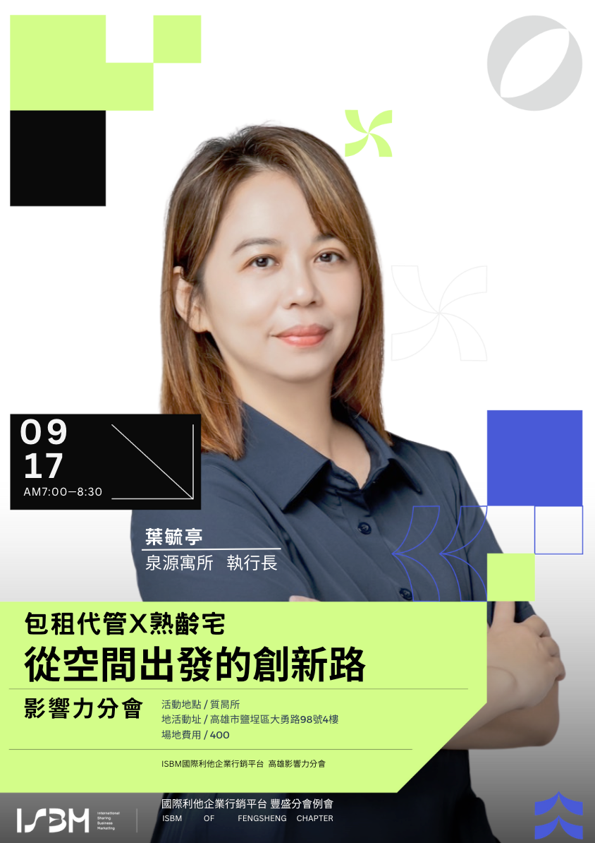 時間:9/17 (三) 早上6:45 - 8:30(請參加6:45的商務交流)地點:質晑所 (高雄市鹽埕區大勇路98號4樓)費用:場地費(含早餐) 400元主題:從空間出發的創新路