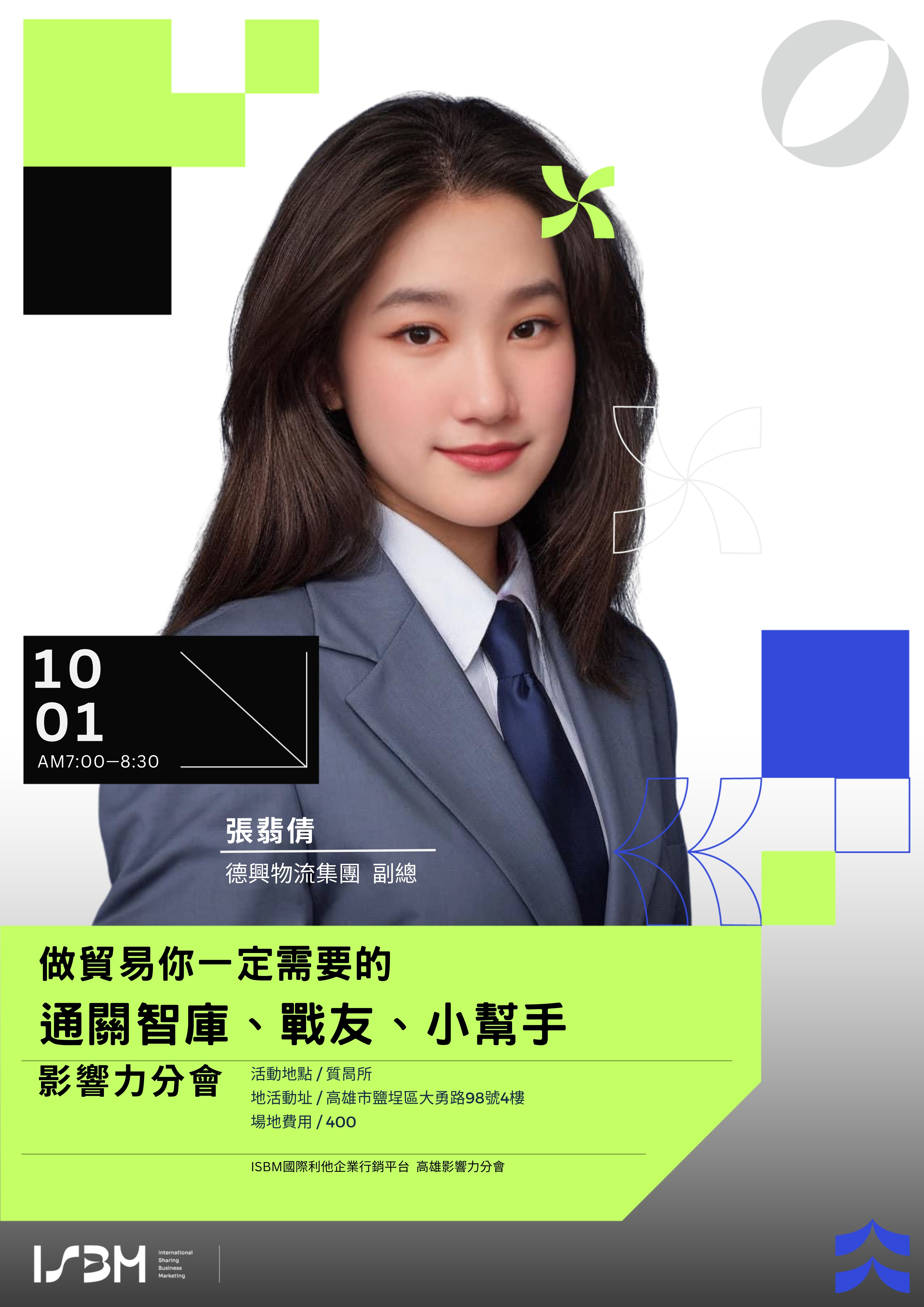 時間:10/1 (三) 早上 7:00 - 8:30 ( 鼓勵參加 6:45-7:00的商務交流 )地點:質晑所 (高雄市鹽埕區大勇路98號4樓)費用:場地費(提供飲品) 400元主題:做貿易你一定需的 通關智庫、戰友、小幫手-若您認同ISBM國際利他的核心價值,也願意給自己一個機會來認識最有效益的行銷平台,邀請您填寫「ISBM國際利他企業行銷平台會議」報名表單,將會有專人聯繫您,謝謝!