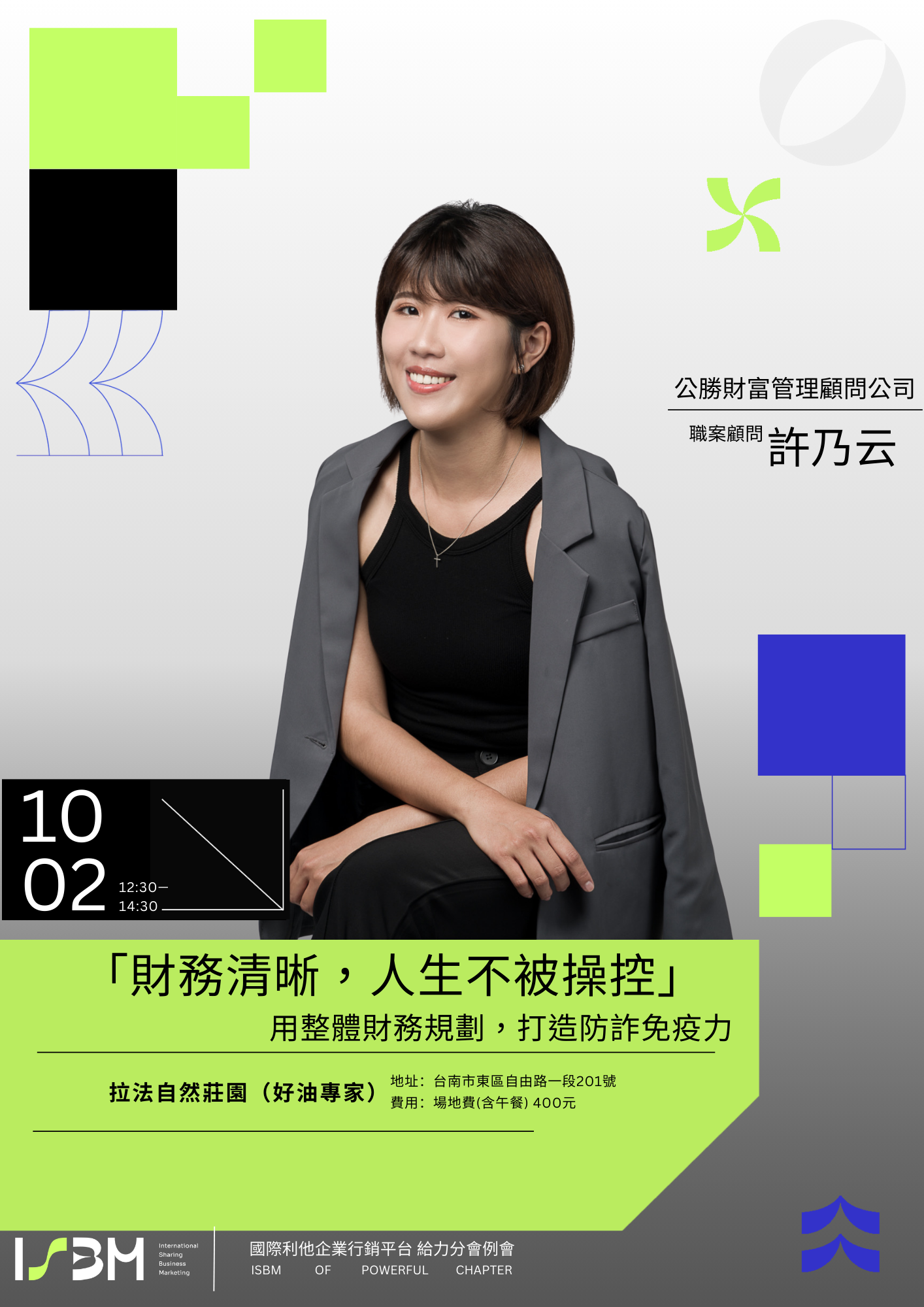 時間:10/02(四) 中午 12:30-14:30 (鼓勵參加12:30-13:00的商務交流)地點:好油專家3F(台南市東區自由路一段201號)費用:場地費(含早餐) 400元主題:財務清晰,人生不被操控