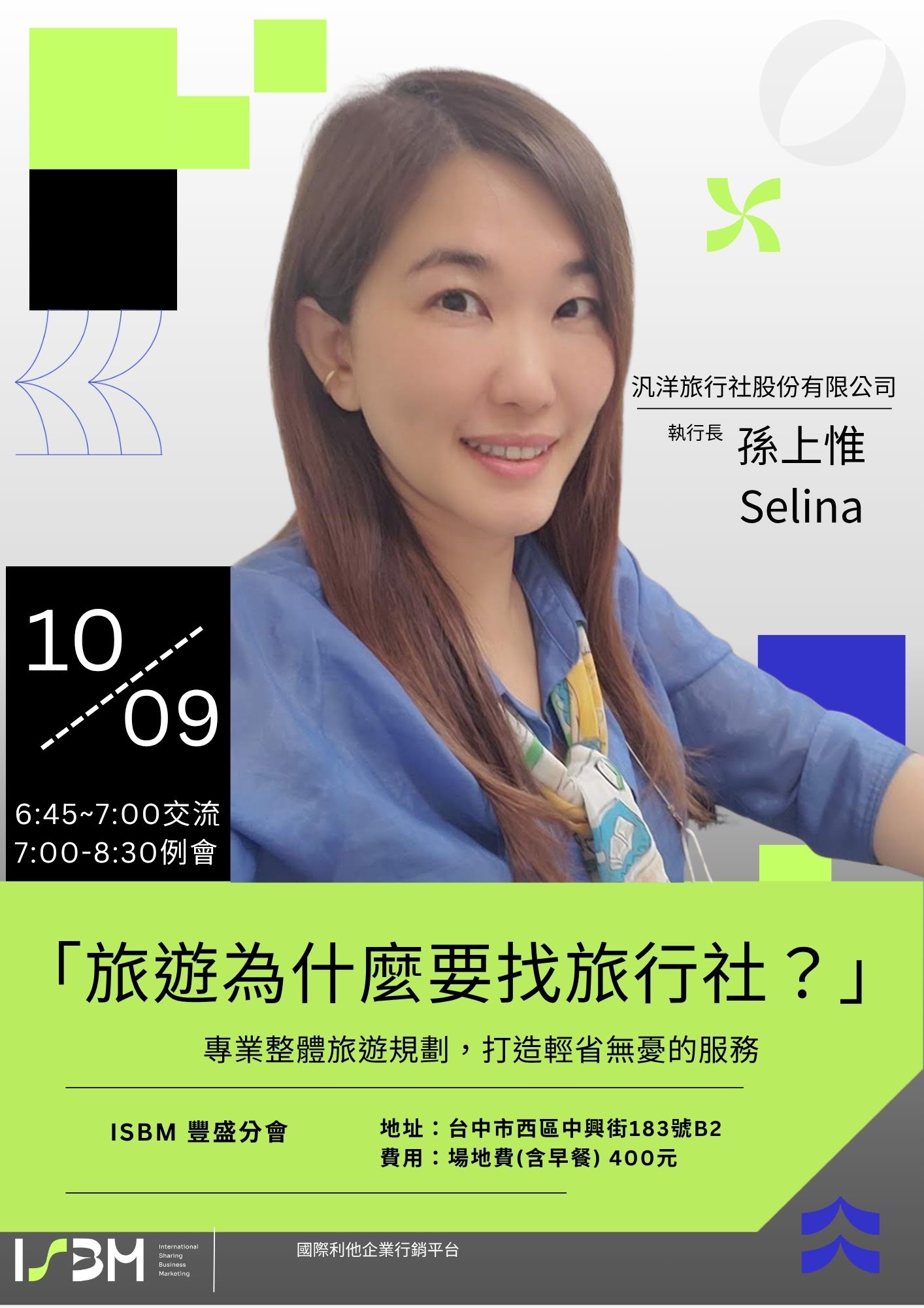 時間:10/09 (四) 早上7:00-8:30(請參加6:45的商務交流)地點:CHILL OUT(台中市西區中興街183號B2)費用:場地費(含早餐) 400元主題:旅遊為什麼要找旅行社若您認同ISBM國際利他的核心價值,也願意給自己一個機會來認識最有效益的行銷平台,邀請您填寫「ISBM國際利他企業行銷平台會議」報名表單,將會有專人聯繫您,謝謝!