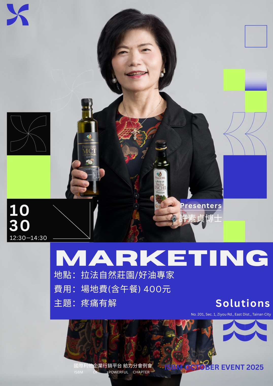 時間:10/30(四) 中午 12:30-14:30 (鼓勵參加12:30-13:00的商務交流)地點:好油專家3F(台南市東區自由路一段201號)費用:場地費(含早餐) 400元主題:疼痛有解