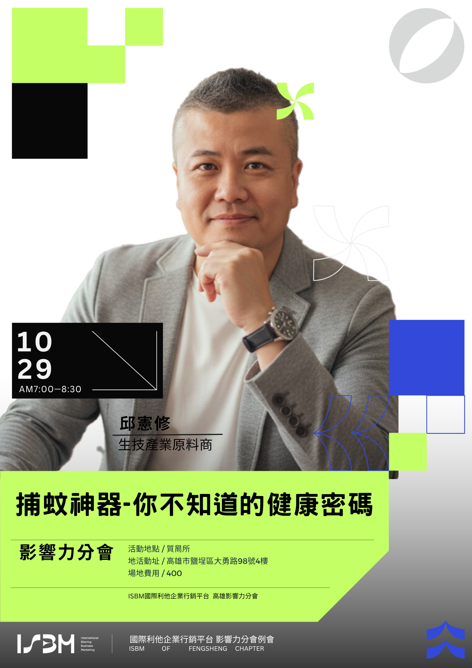 時間:10/29(三) 早上 7:00 - 8:30 ( 鼓勵參加 6:45-7:00的商務交流 )地點:質晑所 (高雄市鹽埕區大勇路98號4樓)費用:場地費(提供飲品) 400元主題:捕蚊神器-你不知道的健康密碼若您認同ISBM國際利他的核心價值,也願意給自己一個機會來認識最有效益的行銷平台,邀請您填寫「ISBM國際利他企業行銷平台會議」報名表單,將會有專人聯繫您,謝謝!