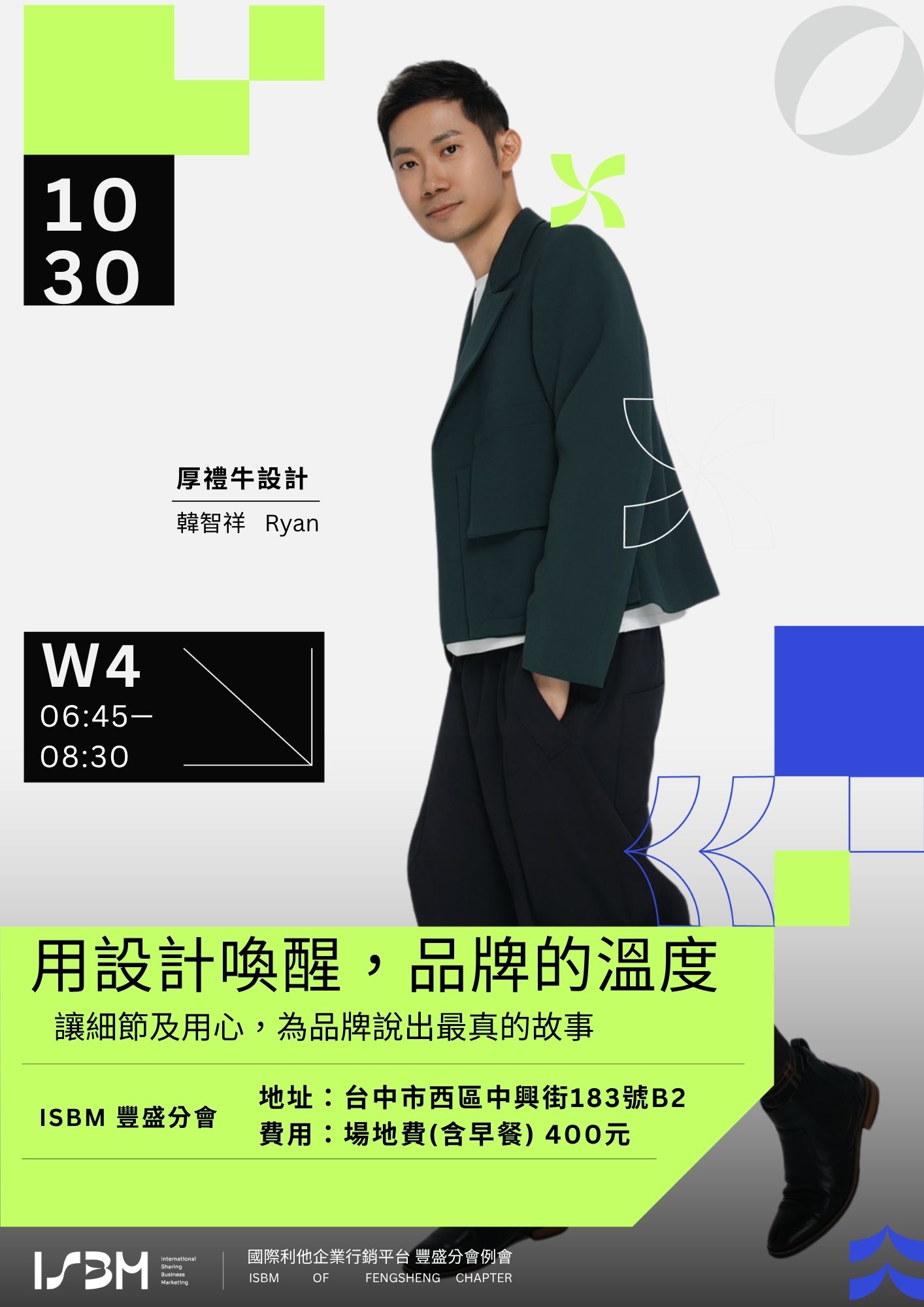 時間:10/30(四) 早上7:00-8:30(請參加6:45的商務交流)地點:台中市西區中興街183號B2 (市民廣場旁)費用:場地費(含早餐) 400元主題:用設計喚醒,品牌的溫度若您認同ISBM國際利他的核心價值,也願意給自己一個機會來認識最有效益的行銷平台,邀請您填寫「ISBM國際利他企業行銷平台會議」報名表單,將會有專人聯繫您,謝謝!