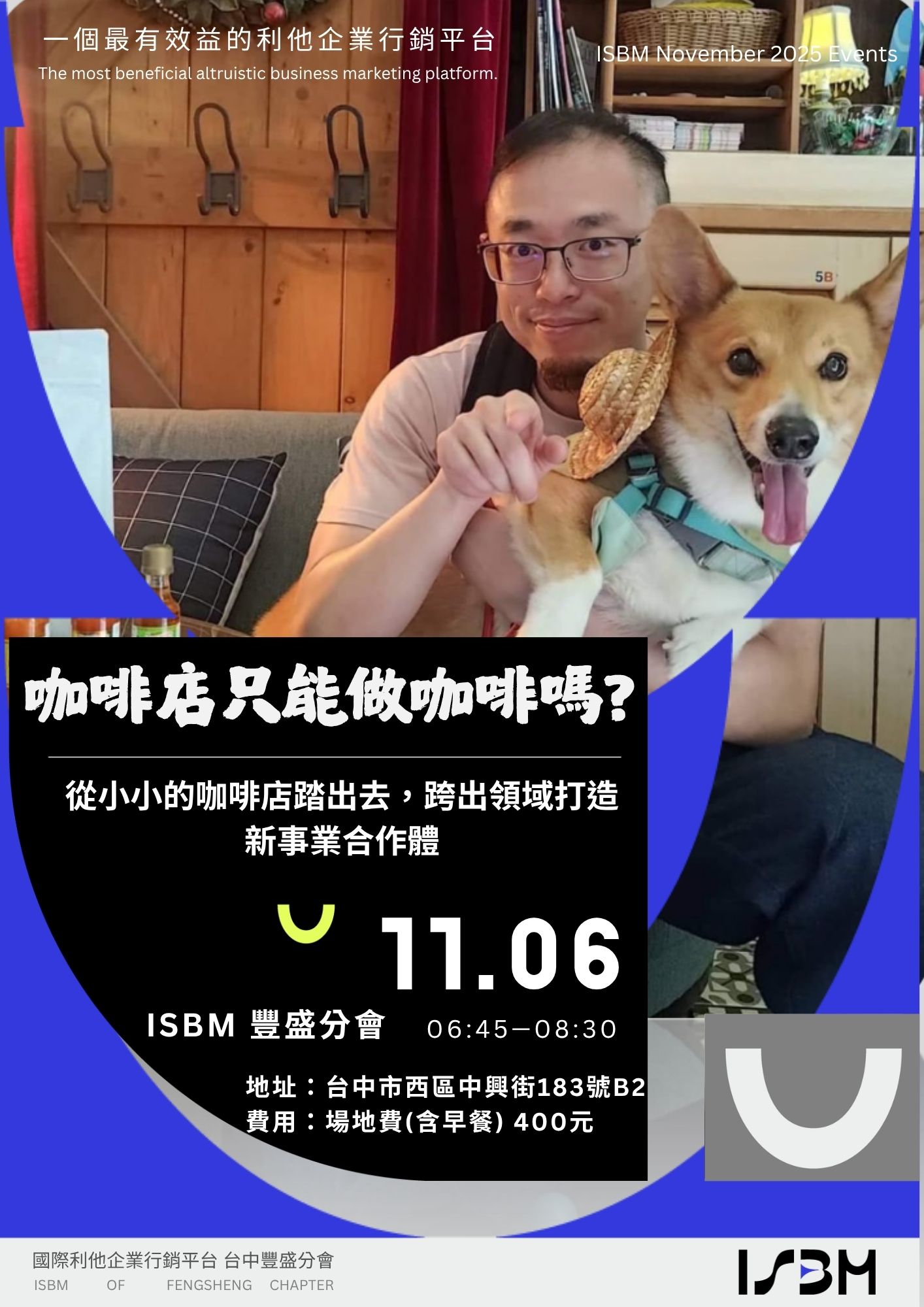 時間:11/06(四) 早上7:00-8:30(請參加6:45的商務交流)地點:台中市西區中興街183號B2 (市民廣場旁)費用:場地費(含早餐) 400元主題:咖啡店只能做咖啡嗎?若您認同ISBM國際利他的核心價值,也願意給自己一個機會來認識最有效益的行銷平台,邀請您填寫「ISBM國際利他企業行銷平台會議」報名表單,將會有專人聯繫您,謝謝!