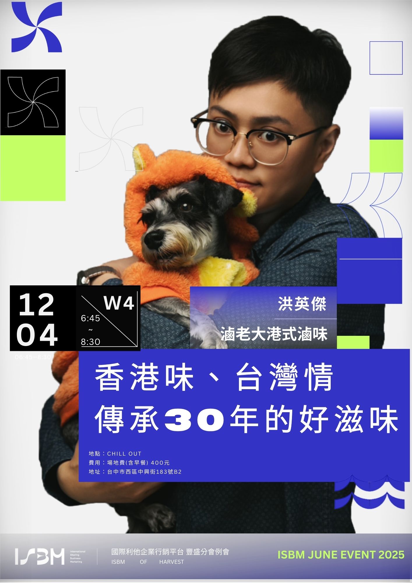 時間:12/4(四) 早上7:00-8:30(請參加6:45的商務交流)地點:台中市西區中興街183號B2 (市民廣場旁)費用:場地費(含早餐) 400元主題:香港味、台灣情 傳承30年的好滋味若您認同ISBM國際利他的核心價值,也願意給自己一個機會來認識最有效益的行銷平台,邀請您填寫「ISBM國際利他企業行銷平台會議」報名表單,將會有專人聯繫您,謝謝!