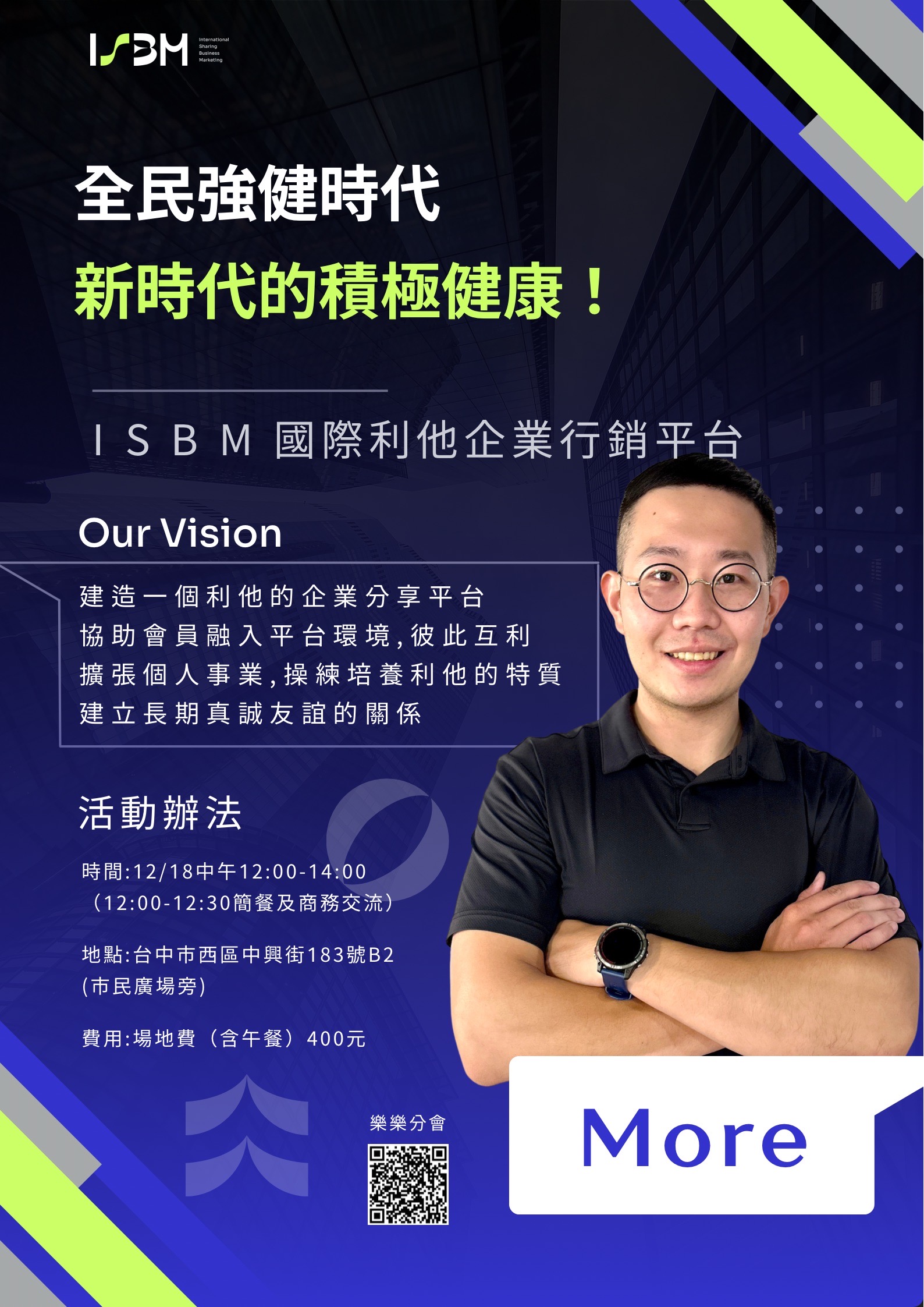 時間:12/18(四) 中午12:00 - 14:00(12:00-12:30餐敘及商務交流)地點:台中市西區中興街183號B2 (市民廣場旁)費用:場地費(含早餐) 400元主題:全民強健時代 新時代的積極健康若您認同ISBM國際利他的核心價值,也願意給自己一個機會來認識最有效益的行銷平台,邀請您填寫「ISBM國際利他企業行銷平台會議」報名表單,將會有專人聯繫您,謝謝!