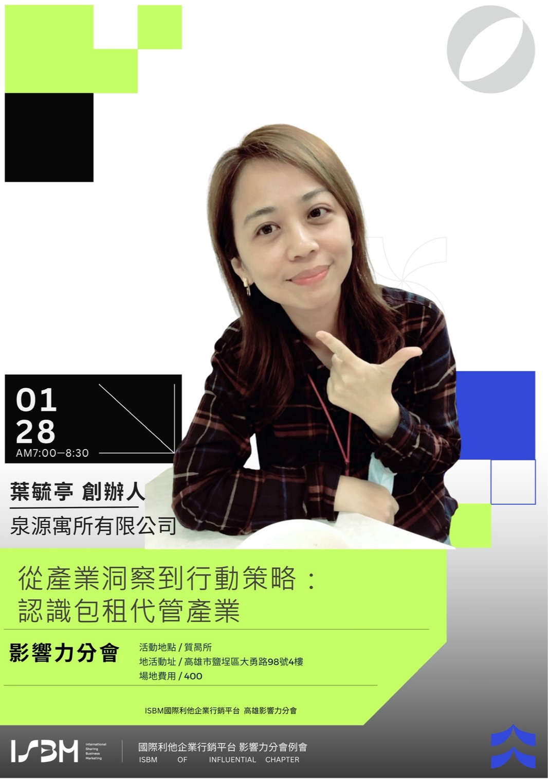 誠摯邀約您,1/28(三)早上6點45分走進 ISBM 影響力分會,參與葉毓亭的專講分享。