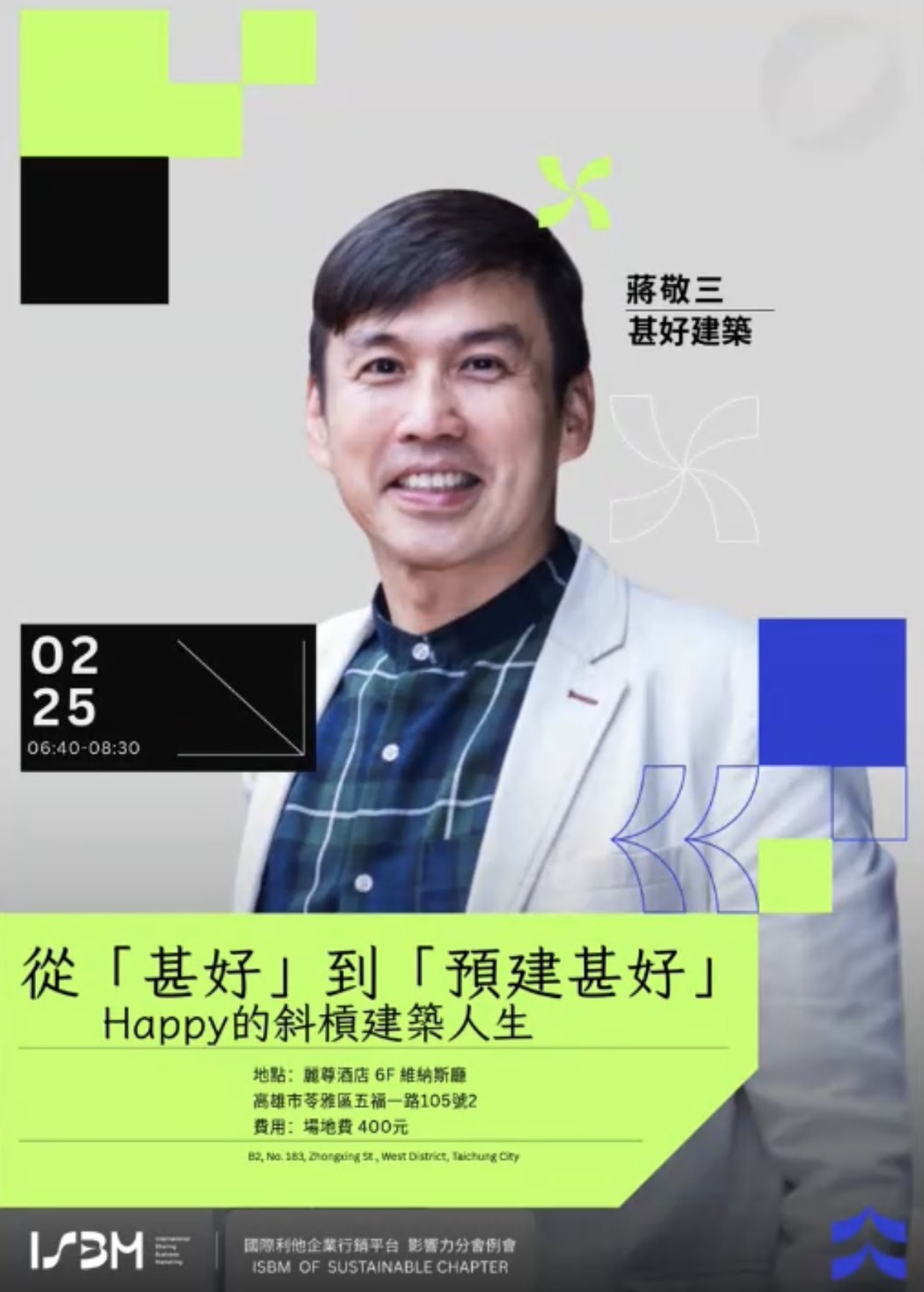 ISBM 影響力分會誠摯邀約您,2/25(三)早上6點45分 ,參與「甚好建築」蔣敬三建築師的專講分享。