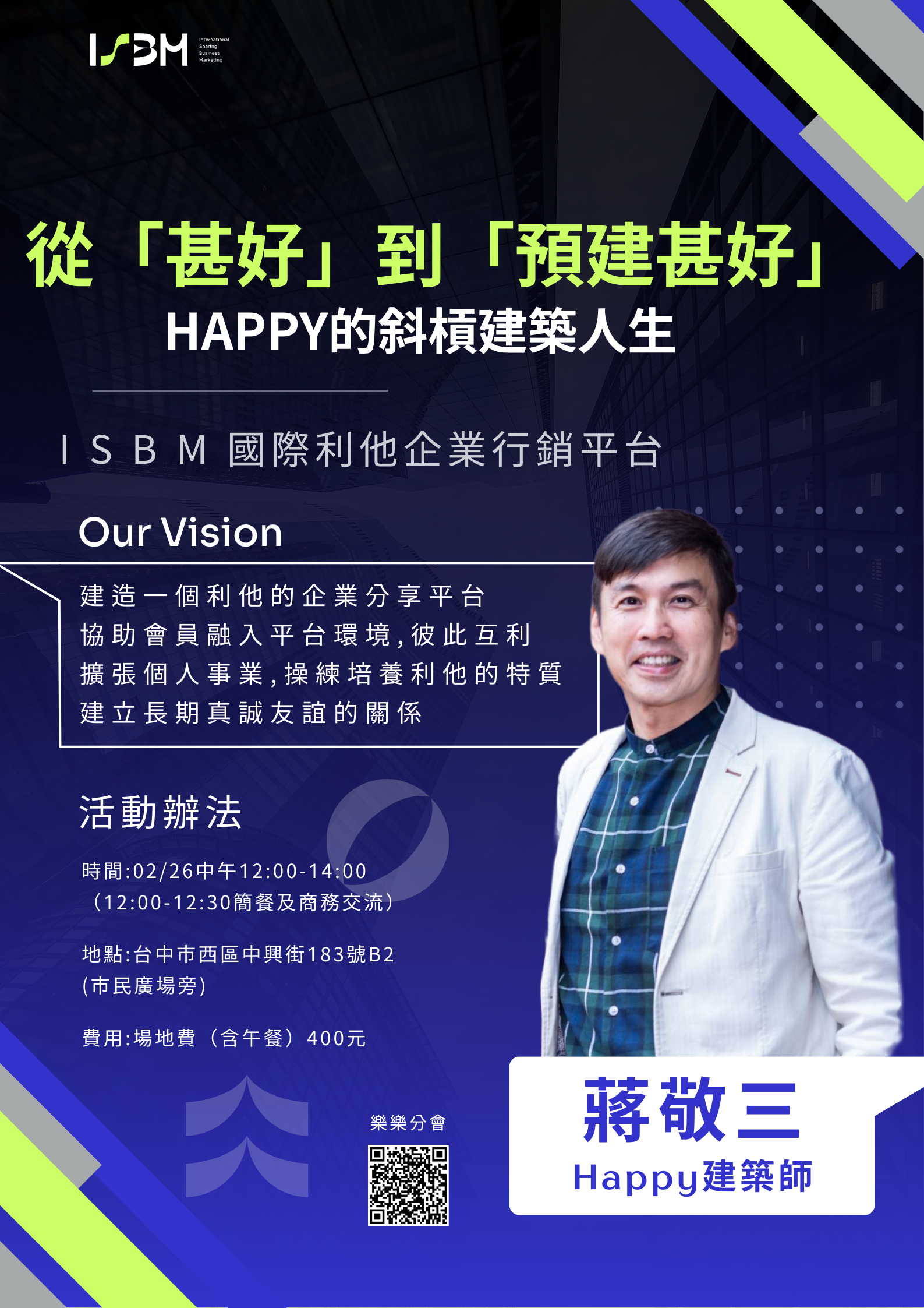 時間:02/26(四) 中午12:00 - 14:00(12:00-12:30餐敘及商務交流)地點:台中市西區中興街183號B2 (市民廣場旁)費用:場地費(含早餐) 400元主題:從[甚好]到[預建甚好] HAPPY的斜槓建築人生