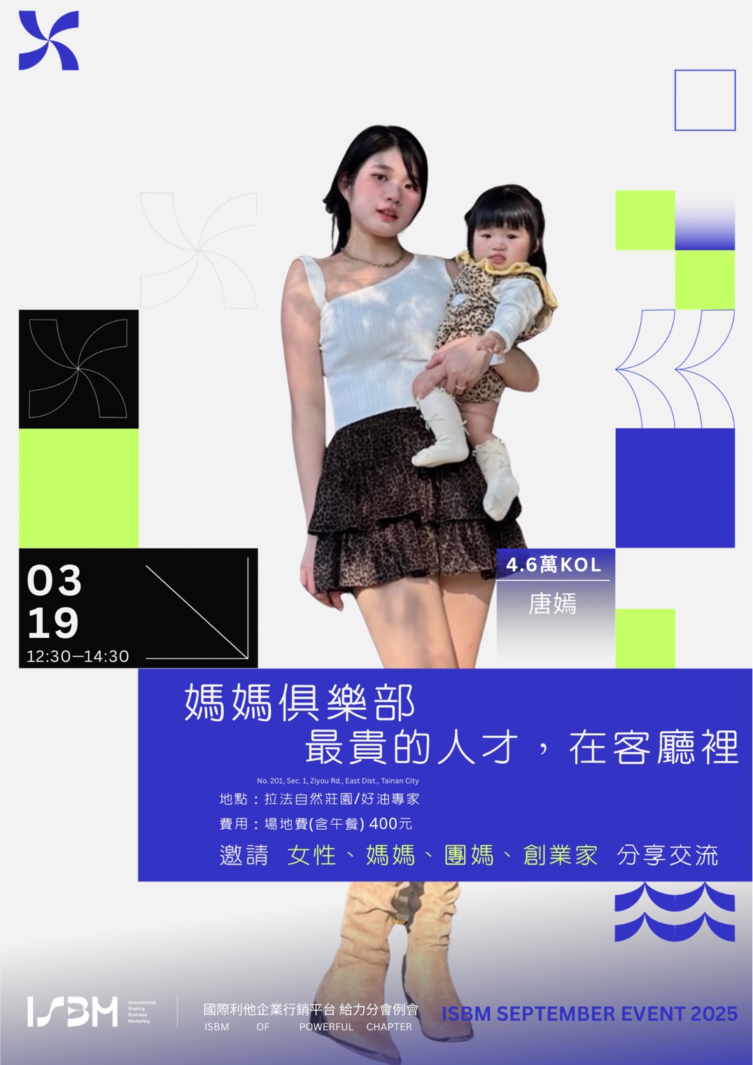 時間:3/19(四) 中午 12:30-14:30 (鼓勵參加12:30-13:00的商務交流)地點:好油專家3F(台南市東區自由路一段201號)費用:場地費(含早餐) 400元主題:媽媽俱樂部 最貴的人才,在客廳裡