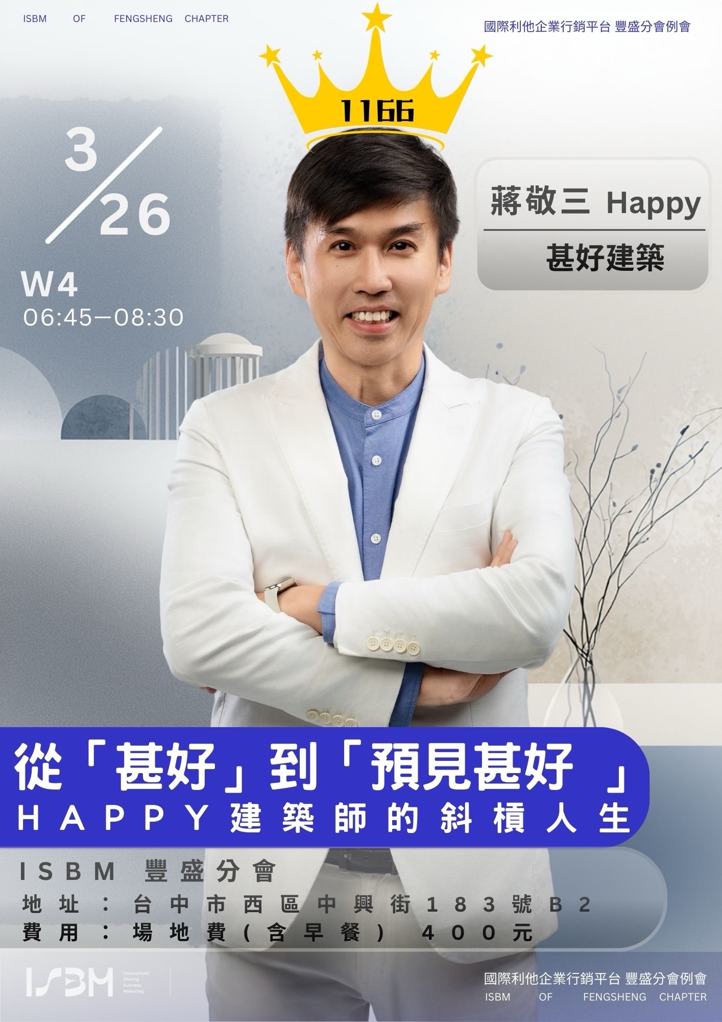 🗓 時間:3/26(四) 早上 7:00 - 8:30 ( 鼓勵參加 6:45-7:00的商務交流 )📌 地點:台中市西區中興街183號B2 (市民廣場旁)👛 費用:場地費(含早餐) 400元🎯 主題:從甚好到預見甚好