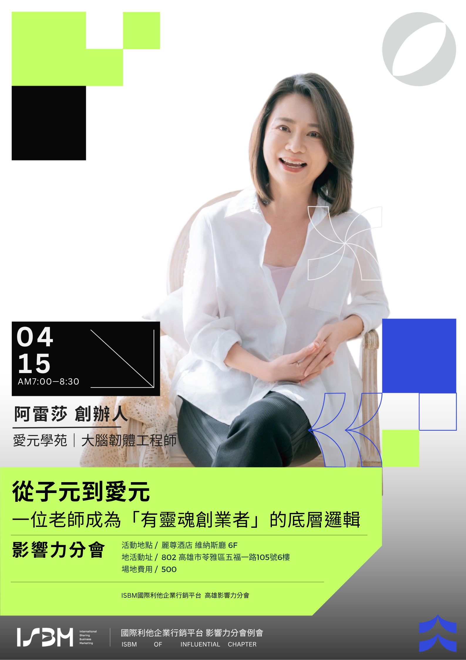 💎 「如果一個七歲的孩子能長出自律,你的團隊一定也可以。」 我曾在教育現場,看著帶著診斷書的孩子,從混亂走向自我掌控;也曾在西班牙 800 公里的朝聖之路上,看見自己從恐懼人群到站上講台。 這不是奇蹟,而是一套關於「生命 × 生活 × 生意」的徹底實踐。身為領袖,我們不只是在經營事業,更是在經營一套人生系統。 【 專講亮點:從救火隊到賦能者 】 🔹更新經營大腦 從疲於奔命的「救火隊」,轉身成為啟動潛能的「賦能者」。 🔹建構自轉系統 讓團隊主動協作,釋放領導者的時間,找回生命的節奏。 【 請幫我引薦 】 👤 重視組織文化的企業主 希望打造「共好、共榮」團隊,而不只是追求數字的領導者。 👤 0 到 1 的創業者或個人品牌 渴望建立一套「有靈魂的經營系統」,協助你找對節奏、少走微路。 📍 【 活動資訊 】 📅 時間: 4/15(三)06:45 - 08:30 🏢 地點: 麗尊酒店 6 樓(高雄市苓雅區五福一路105號) 💰 費用: 500 元(含場地費) 🔗 報名連結: https://forms.gle/Z7ukeU9c7RhVyb7F9 👔 請著正裝,並攜帶 30 張名片,與全場領袖交流。 ✨ 讓我們在早晨時光裡, 一起打開「系統思考 X 社會價值」的新視野。 ISBM影響力分會邀約