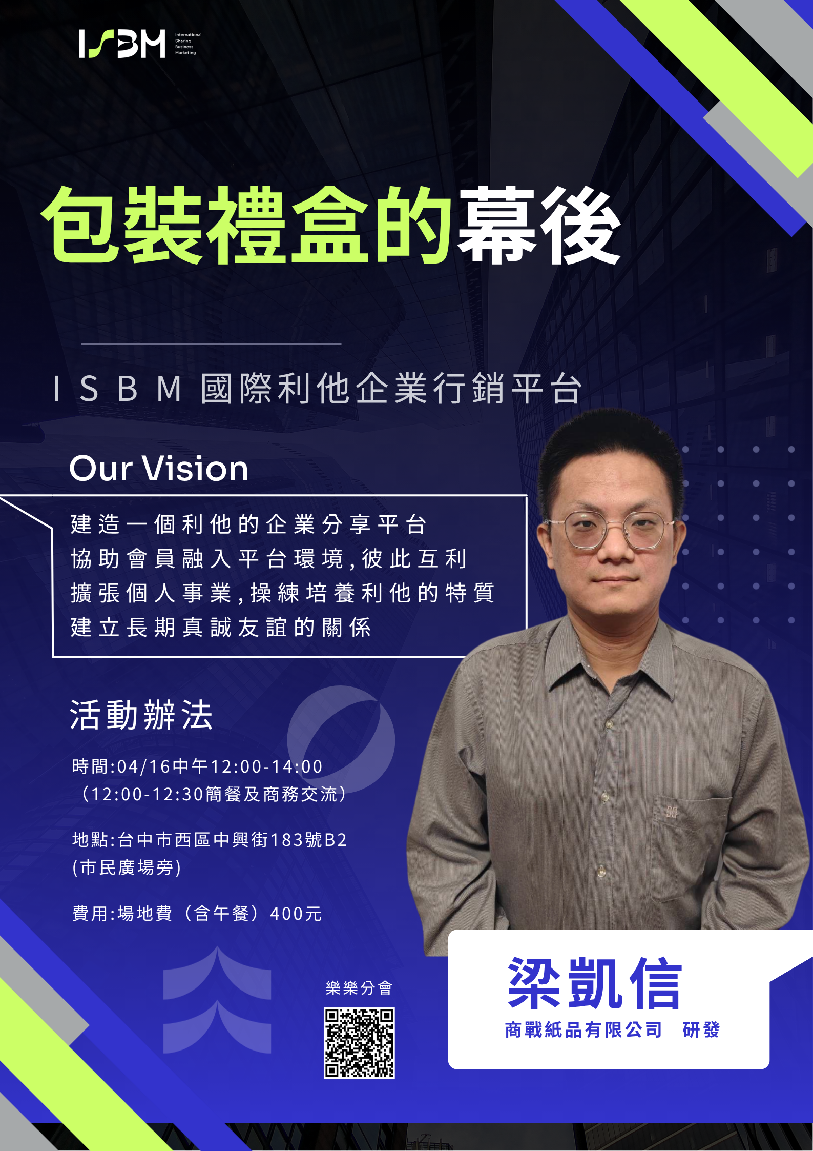 🗓 時間:4/16(四) 中午12:00 - 14:00(12:00-12:30餐敘及商務交流)📌 地點:台中市西區中興街183號B2 (市民廣場旁)👛 費用:場地費(含早餐) 400元🎯 主題:包裝禮盒的幕後