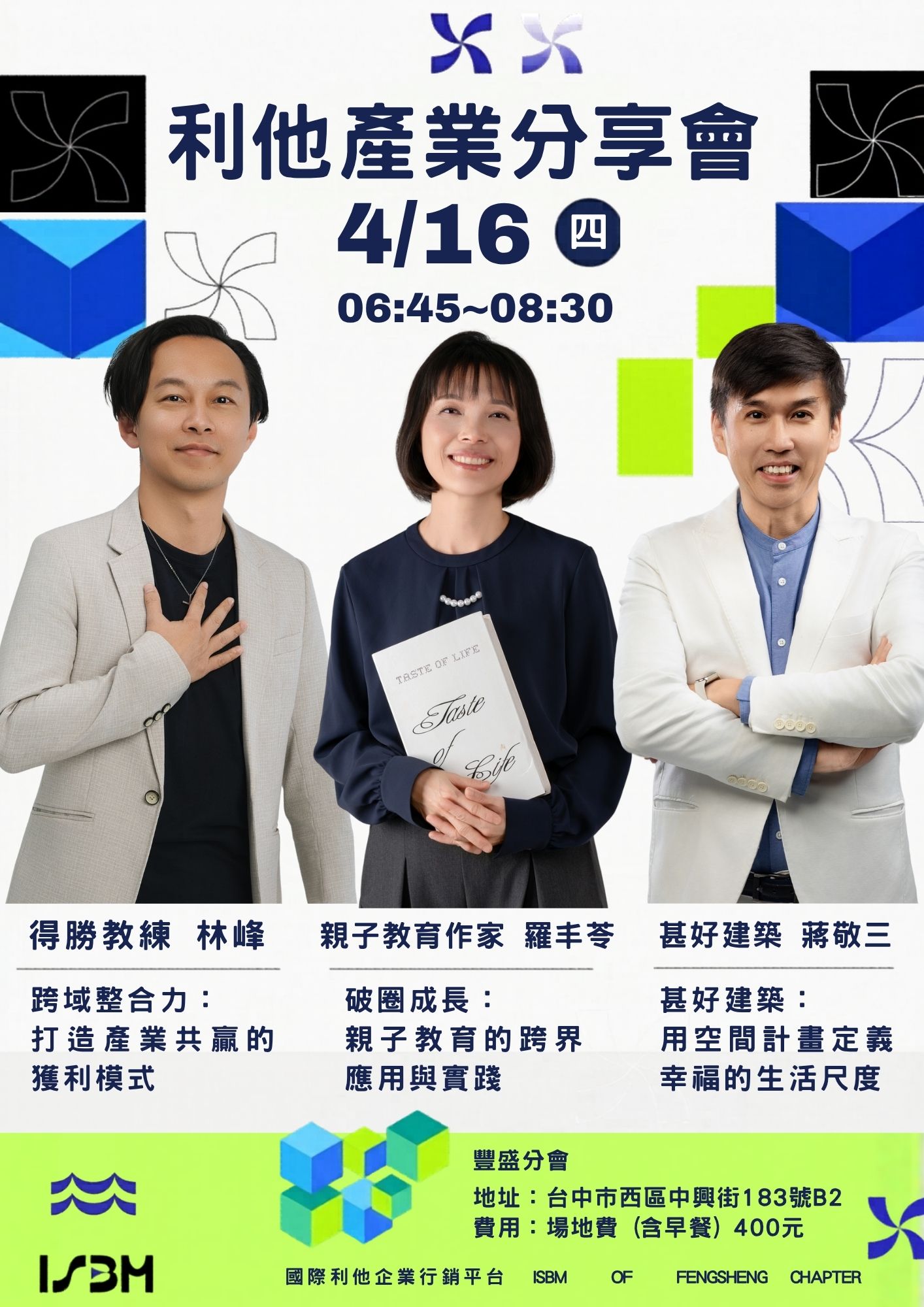 早起,是為了遇見更好的合作契機!☕ 本次利他分享會,精選三大核心主題: ✅ 跨界合作: 掌握倍增價值的實踐心法。 ✅ 教育賦能: 探索親子教育的跨界影響力。 ✅ 職人建築: 定義幸福生活的空間美學。 誠摯邀請各界夥伴共同交流,在利他中看見更大的可能! 📅 時間:4/16 (四) 06:45-08:30 📍 地點:台中市西區中興街183號B2